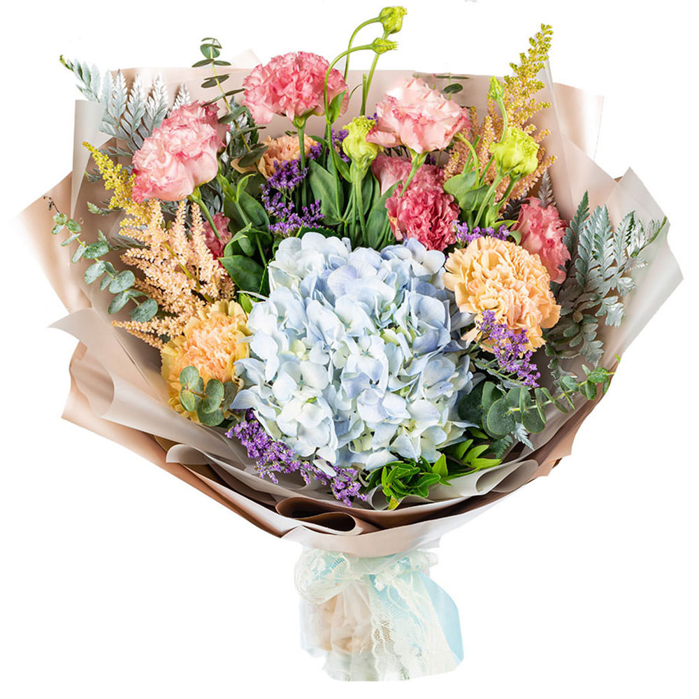 Гортензия голубая, гвоздика кремовая и розовая, эустома, самшит, чико. Упаковка (лента, пленка, крафт, сетка, пленка матовая)