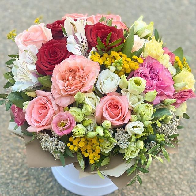 Роза пионовидная красная, роза кустовая розовая, аспидистра, куст ежевики. Упаковка (шляпная коробка, квадратный бокс, коробка сердце, оазис)